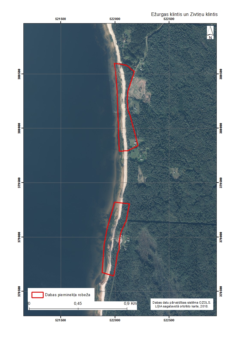 Teritorijā krāšņākie atsegumi sastopami iecirknī starp Siliņiem un Zivtiņām, kur atsegumu augstums sasniedz 6 metrus. Lielāki atsegumi ir arī posmā starp Ķurmjragu un Ežurgām – aptuveni šā posma vidū, kur pludmalē atsevišķi no krasta kraujas atrodas smilšakmens izcilnis – izveidojies kā erozijas paliksnis. Vēl ievērojami atsegumi ir stāvkrastā iepretim Ežurgām, kā arī dienvidos no Kāpniekiem un Vilnīšiem.