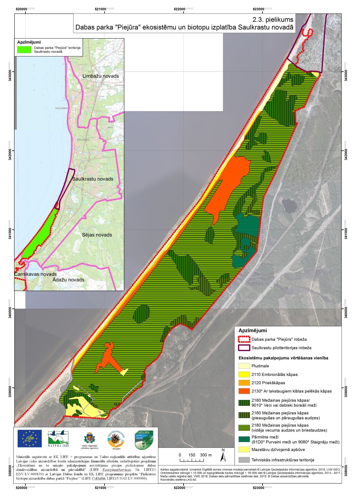 Teritorija veidota daudzu retu piejūras biotopu aizsardzībai, mezotrofu ezeru ar oligotrofu līdz mezotrofu augu sabiedrībām minerālvielām nabadzīgās ūdenstilpēs un to krastmalās. Īpaši nozīmīgi ir tādi biotopi kā embrionālās kāpas, priekškāpas, mežainas jūrmalas kāpas un veci boreāli meži.