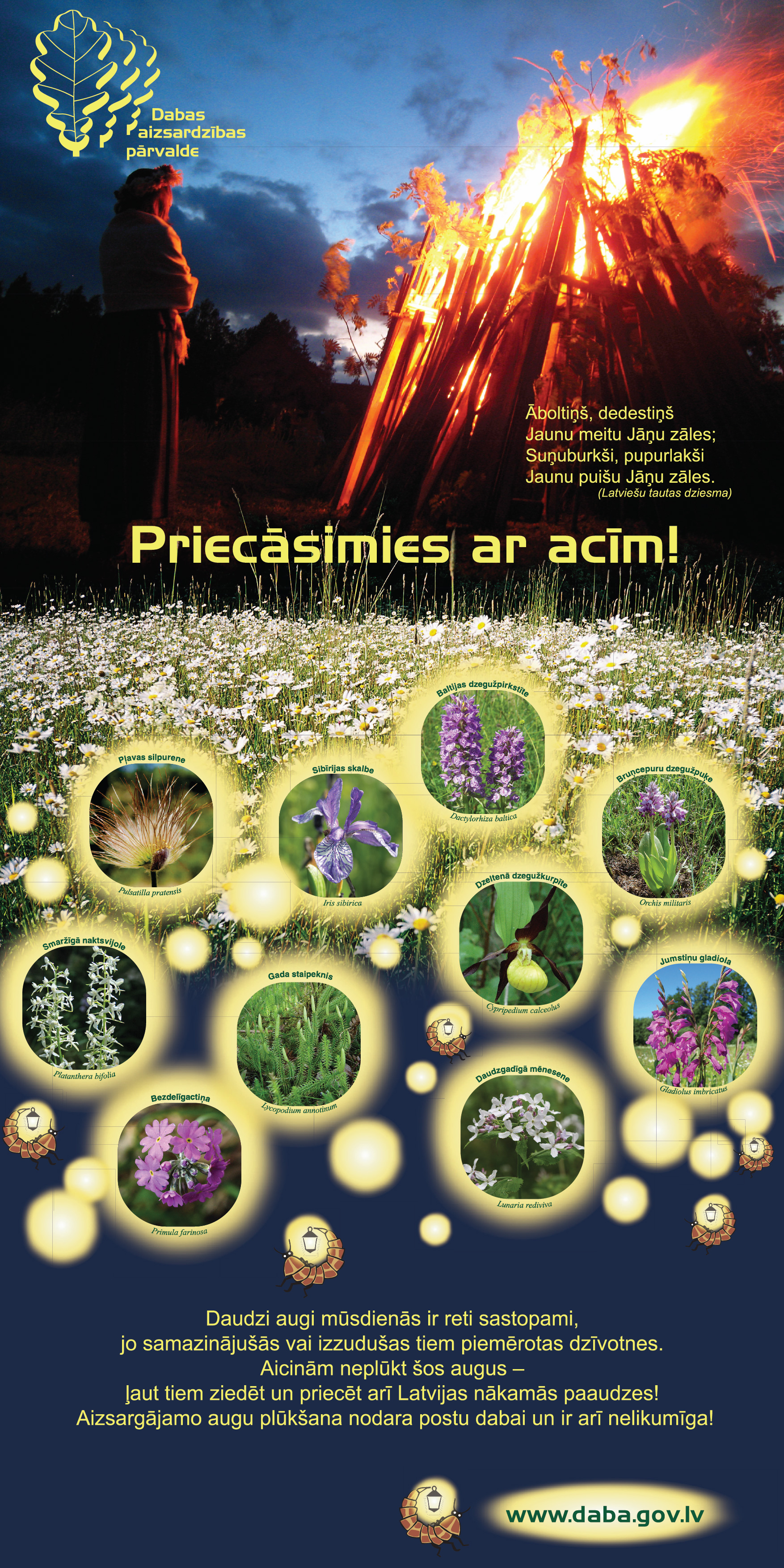 Priecāsimies ar acīm! (A3, JPEG 3,47 MB) Priecāsimies ar acīm! (A4, JPEG 2,8 MB) Daudzi augi mūsdienās ir reti sastopami, jo samazinājušās vai izzudušas tiem piemērotas dzīvotnes. Aicinām neplūkt šos augus - ļaut tiem ziedēt un priecēt arī Latvijas nākmās paudzes! Aizsargājamo augu plūkšana nodara postu dabai un ir arī nelikumīga! |