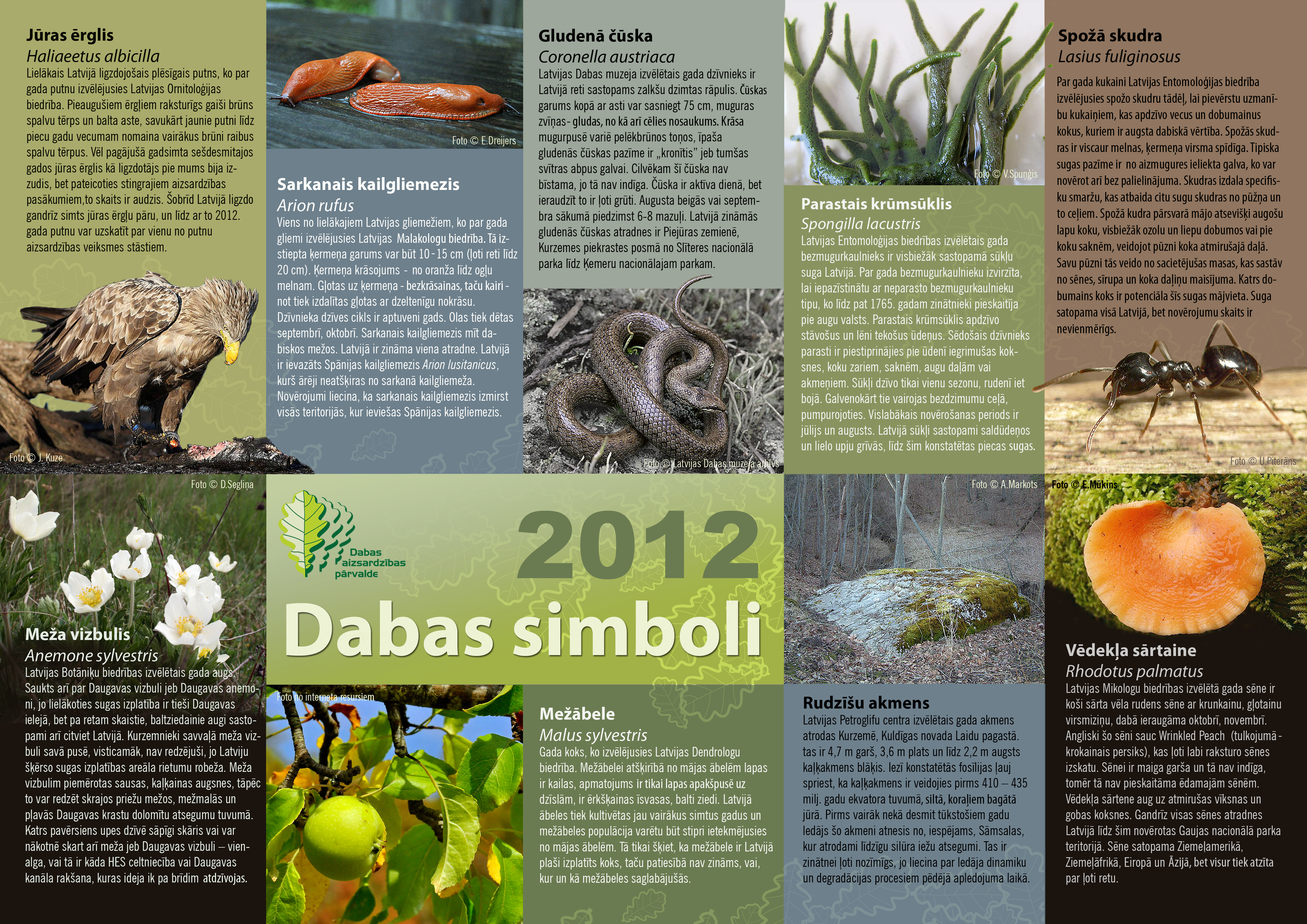 Latvijas nacionālie dabas simboli (PDF 5.13 MB) Plakātu sagatavojusi Latvijas Dabas muzeja atbalsta biedrība un atkārtoti izdevusi Dabas aizsardzības pārvalde Igaunijas- Latvijas -Krievijas Pārrobežu sadarbības programmas līdzfinansētā projekta ELRI-156 "Dabas izglītības sekmēšana - efektīvs līdzeklis sabiedrības dabas apziņas veidošanai" (Cilvēki un daba) ietvaros. |