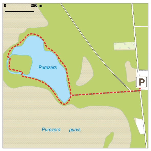 Ejot pa taku, paveras gleznaini purva ezera Purezera skati un augstā purva ainava.