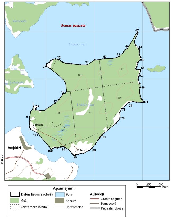 Nozīmīgi biotopi - boreālais mežs, sala bagāta ar vecām dabiski izretinātām priežu audzēm, bet kopumā audžu sastāvs un augšanas apstākļi daudzveidīgi. Viena no trim vai četrām vietām Latvijā, kur atrasta reta sūnu suga - garsetas mēzija. Nozīmīga putnu ligzdošanas vieta, kas papildina blakus esošā Moricsalas dabas rezervāta nozīmi sugu un biotopu aizsardzībai Usmas ezerā. Konstatētas vismaz 9 Eiropas Savienības Putnu direktīvas 1.pielikuma putnu sugas, no tām nozīmīgākās ligzdojošās sugas ir ūpis, jūras ērglis, zivjērglis un apodziņš. Bioloģiski augstvērtīgiem un maz traucētiem mežu biotopiem raksturīgas putnu sugas.