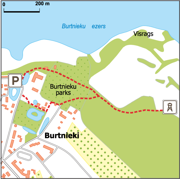 Viens no takas pieturpunktiem ir skatu tornis, no kura labi pārskatāmas Ēķinupes palieņu pļavas un Burtnieka ezera dienvidaustrumu krasts ar smailo Burtnieku baznīcas torni. Torņa augstums 10,6 m